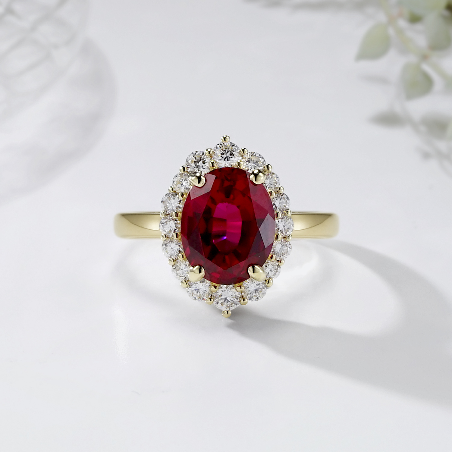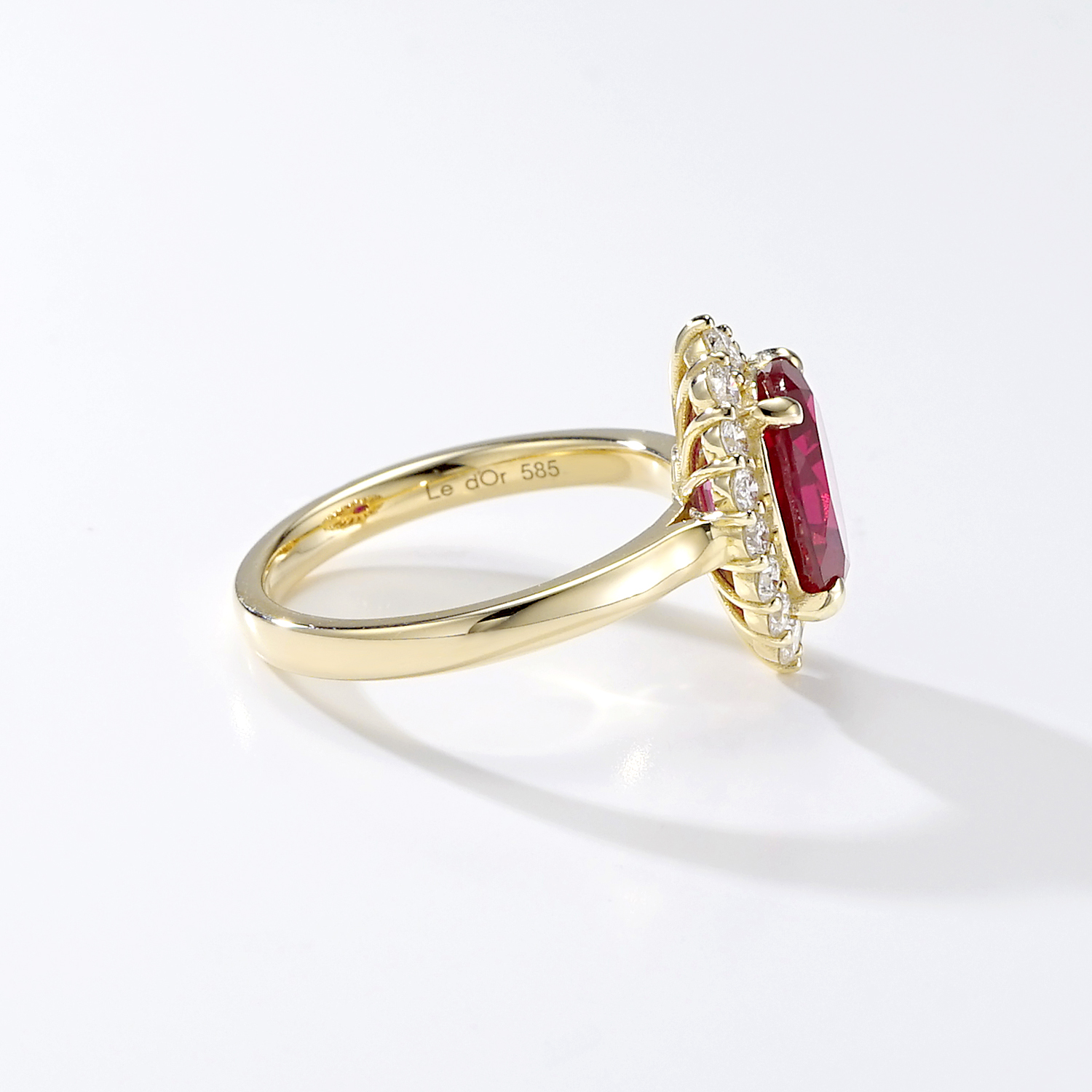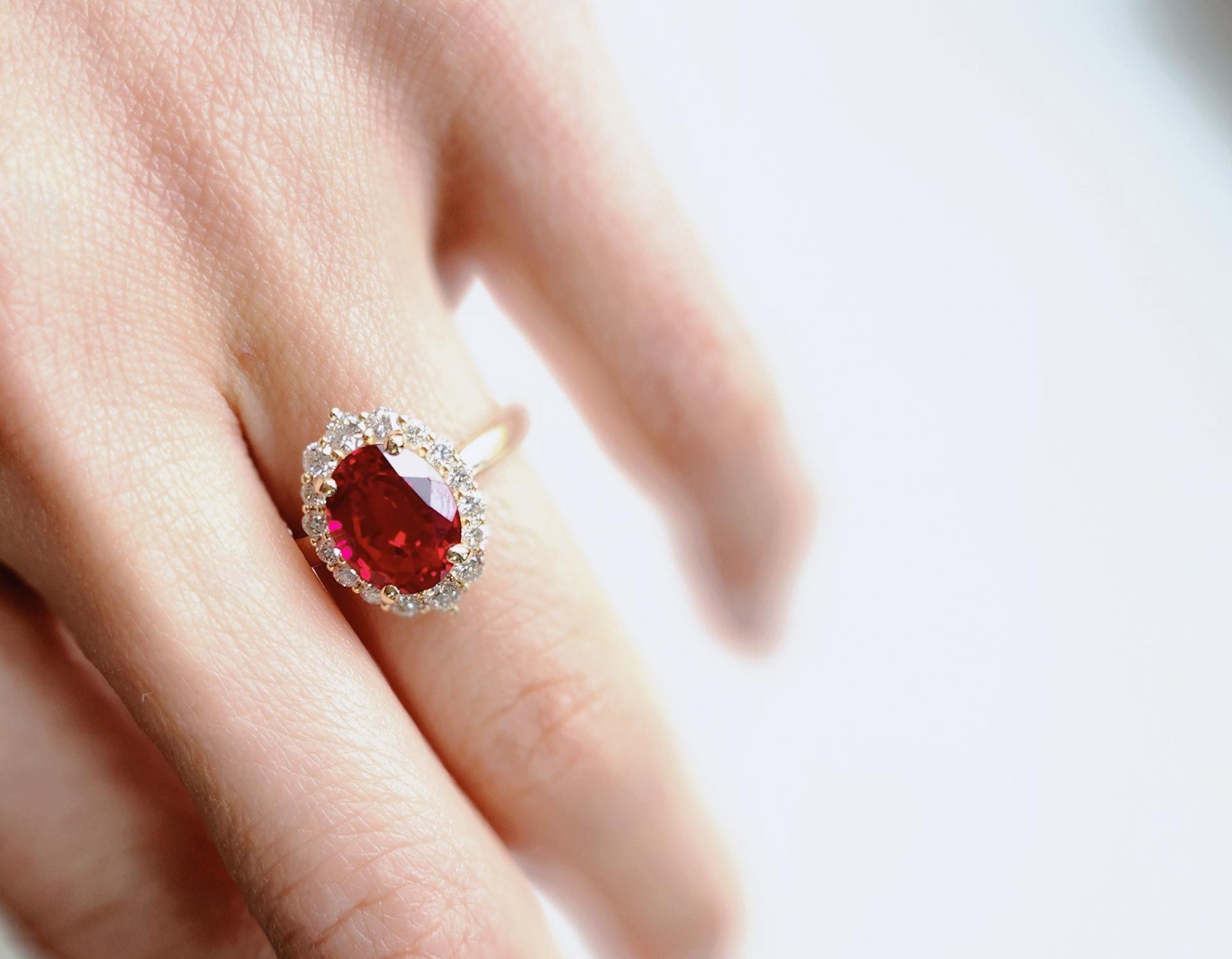 루비를 둘러싼 라운드 브릴리언트 컷 다이아몬드들이 화려한 광채를 더해줍니다.