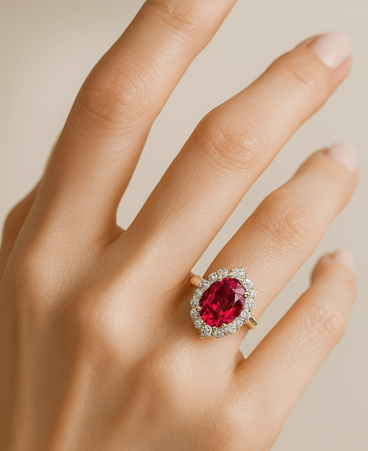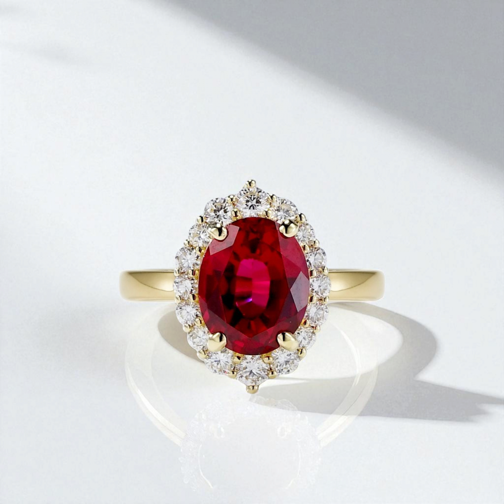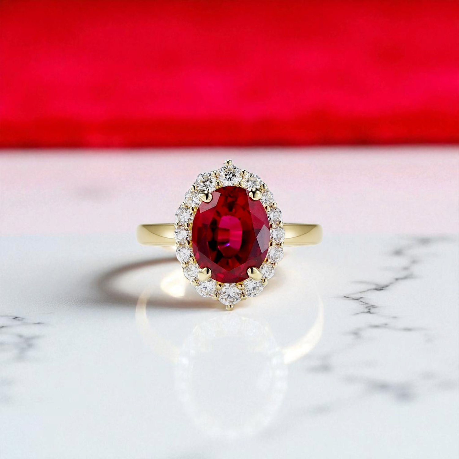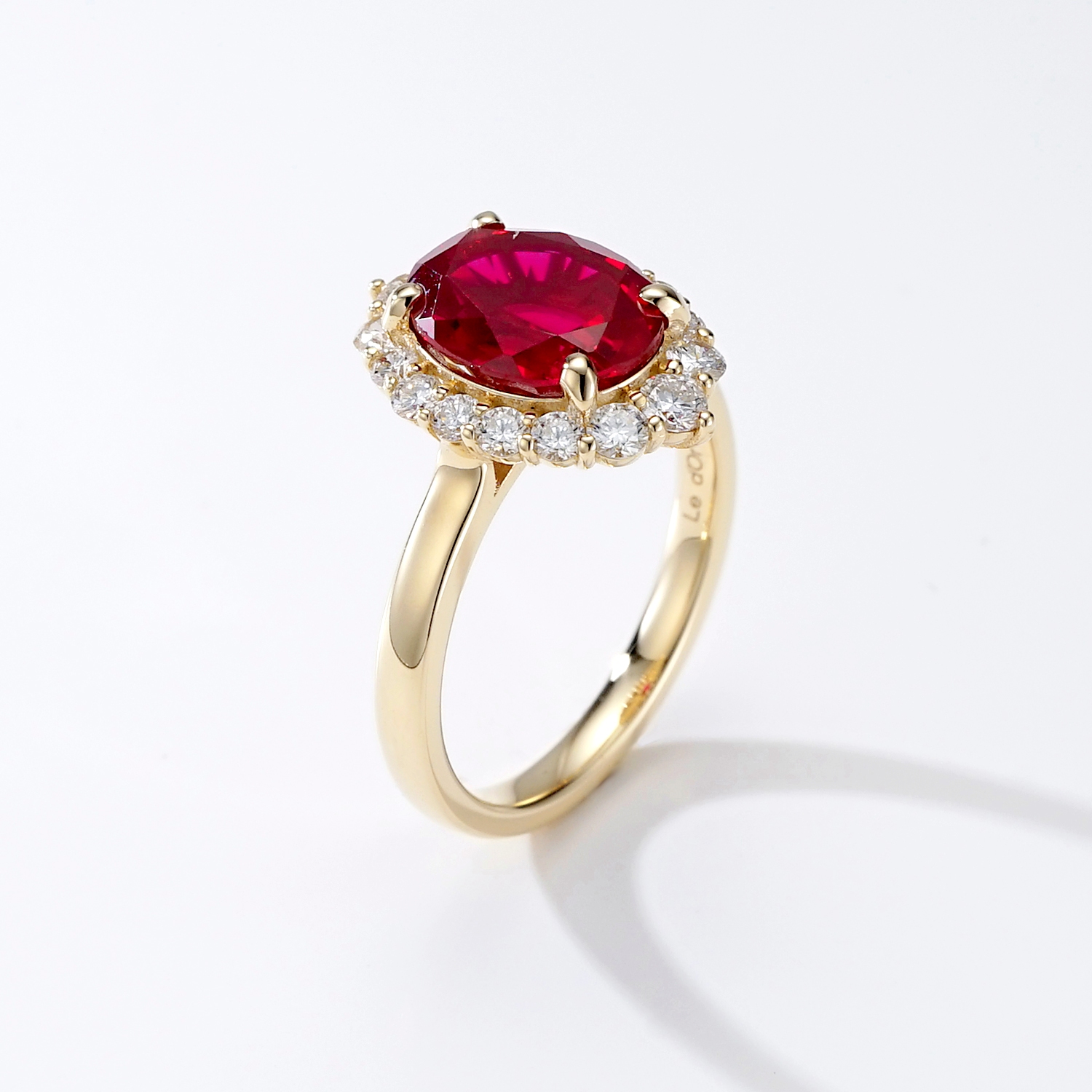 루비를 둘러싼 라운드 브릴리언트 컷 다이아몬드들이 화려한 광채를 더해줍니다.