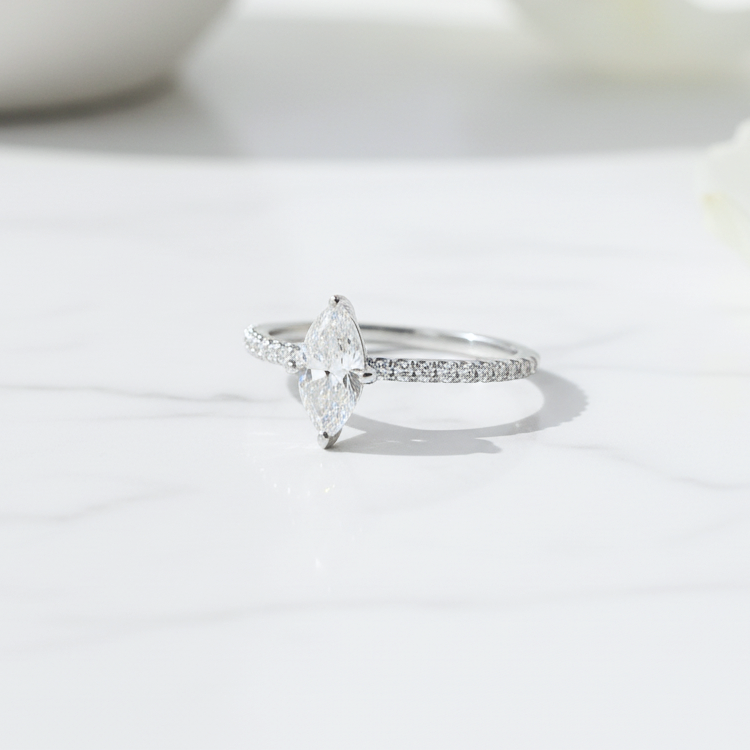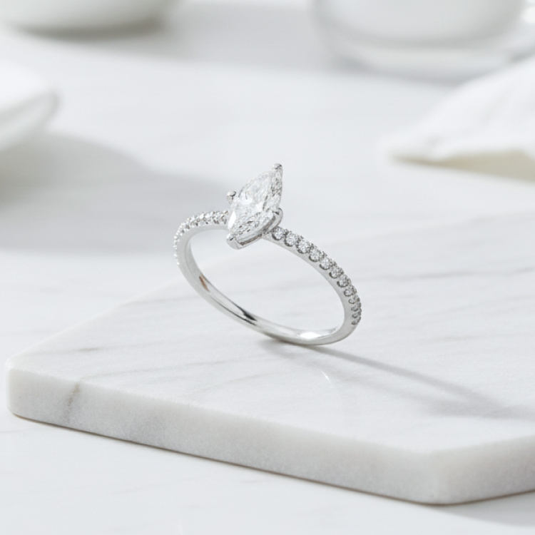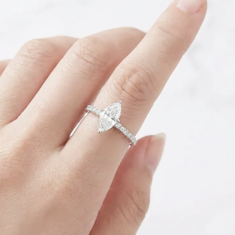 중앙에 세팅된 마퀴즈 컷 스톤이 길게 흐르는 실루엣이 특징으로